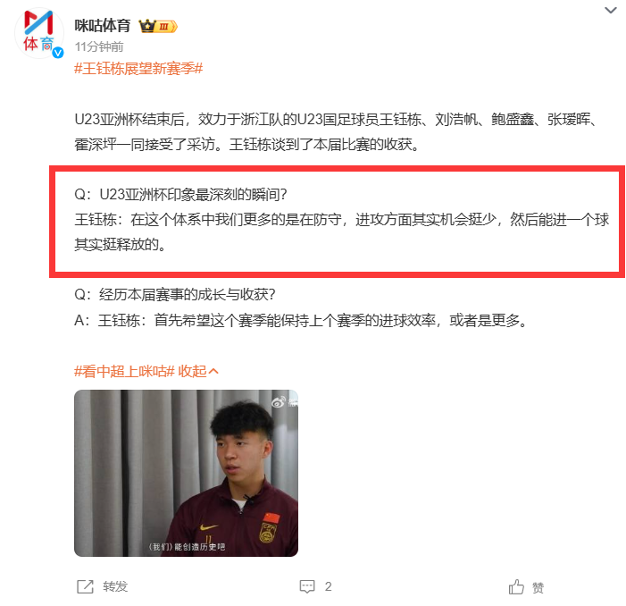 而已经回到浙江队的王钰栋、刘浩帆等球员在晚上7点左右,也接受了媒体的采访。在被问到U23亚洲杯期间印象最深刻的瞬间时,王钰栋的回答多少有些令人意外。